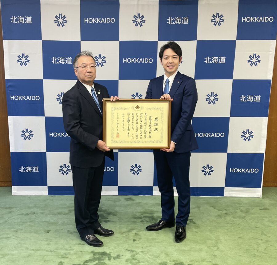 当社は2月28日に100周年を迎えましたが、建設産業の未来を担う次世代の人材育成に役立てていただきたい思いから、道づくりを通じて全道でお世話になっている北海道に寄付をさせていただきました。鈴木直道知事から御礼のお言葉とともに感謝状をいただきました。