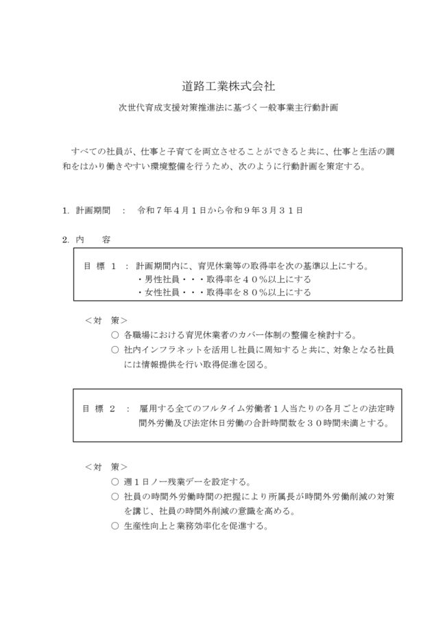 次世代育成支援対策推進法に基づく、「一般事業主行動計画」の期間と目標を新たに策定いたしました。