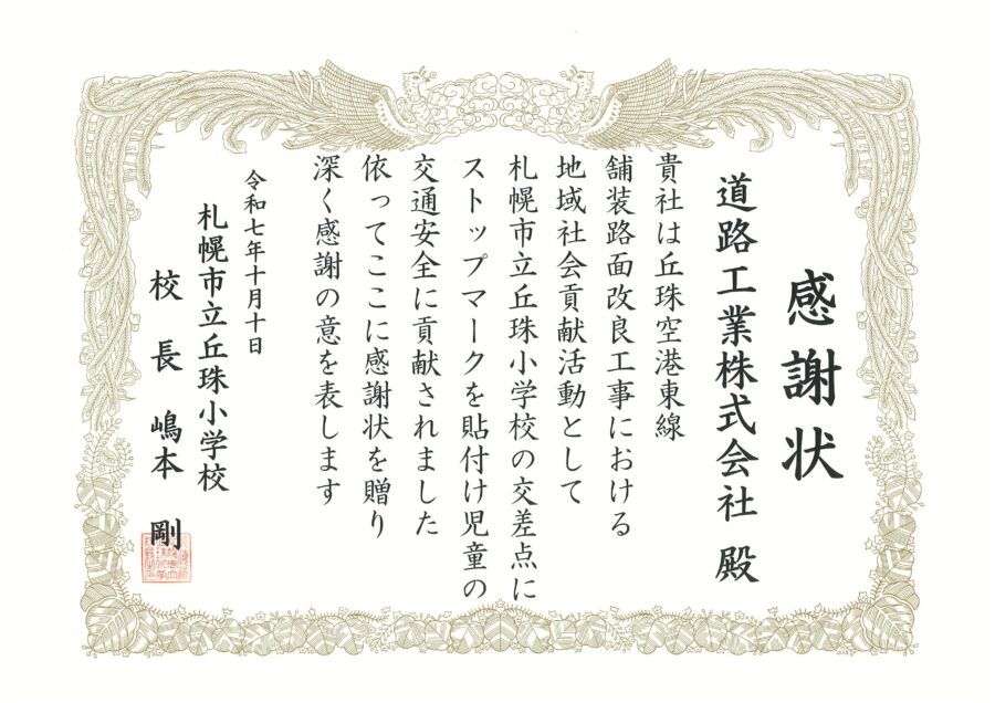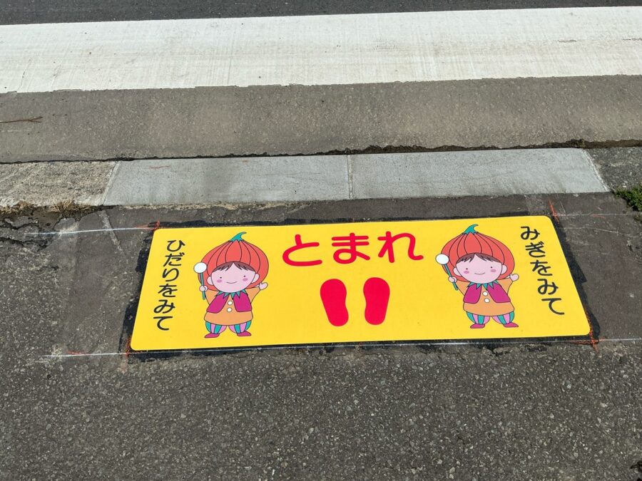 札幌市発注の「道道丘珠空港東線舗装路面改良工事」に伴う地域貢献活動として、札幌市立丘珠小学校周辺の通学路主要交差点にストップマーク14枚を設置しました。