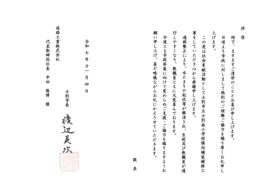 北海道縦貫自動車道舗装工事に伴う地域貢献活動として、士別市立士別南小学校構内舗装補修工事を行いました。学校構内の通路に生じていた段差を補修したことで水たまりや起伏がなくなり、児童や職員の皆さまから「歩きやすく、安全になった」と感謝の声をいただき、同市から感謝状が贈られました。