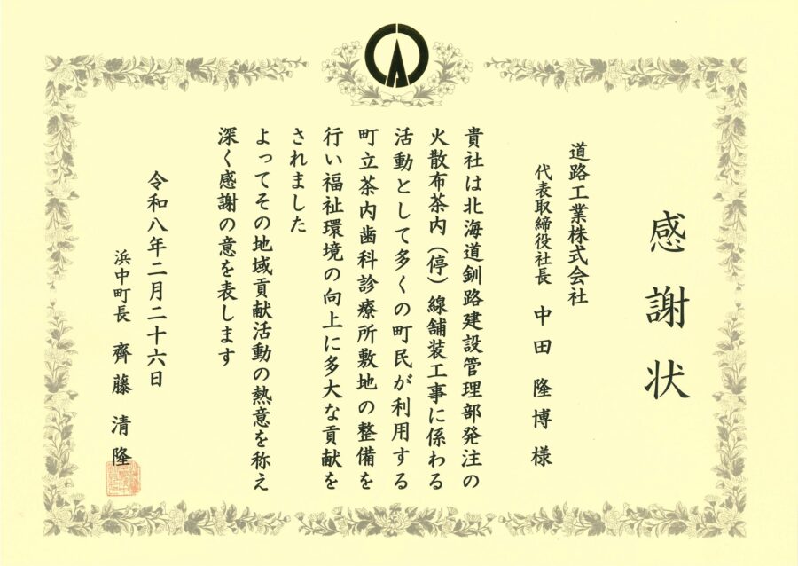 北海道釧路建設管理部発注の「火散布茶内(停)線舗装工事」に係る地域貢献活動として、町立茶内歯科診療所駐車場の段差補修を実施しました。浜中町からの依頼に基づき、経年劣化に伴い生じていた駐車場内の段差を改善し、安全に利用できる環境づくりに取り組みました。この活動が多くの町民の安心につながり、福祉環境の向上に寄与したとして、同町より感謝状をいただきました。